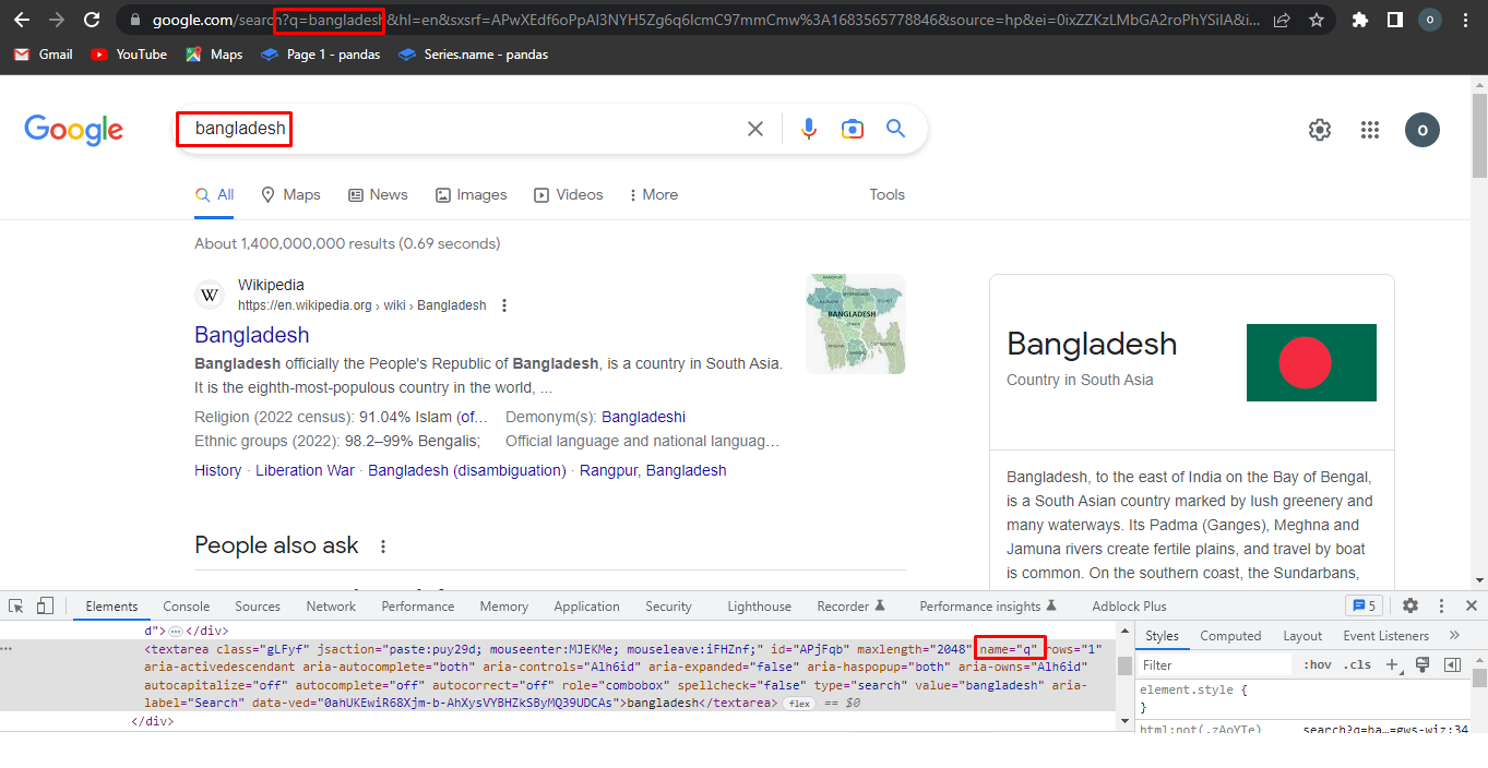 গুগল ওয়েবসাইট টি নিচের মত আমরা ইনপুট প্যারামিটার q এর ভ্যালু হিসাবে যা ফর্ম সাবমিট করবো তার রেজাল্ট শো করবে।