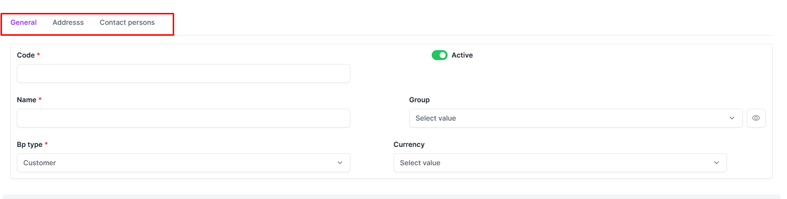 list_display = ('code', 'name', 'bp_type', 'group', 'currency', 'active')