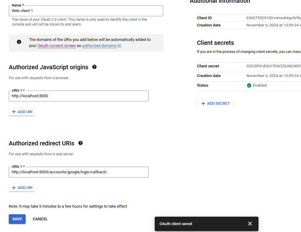http://127.0.0.1:8000/accounts/google/login/callback/ for Authorized redirect URIs