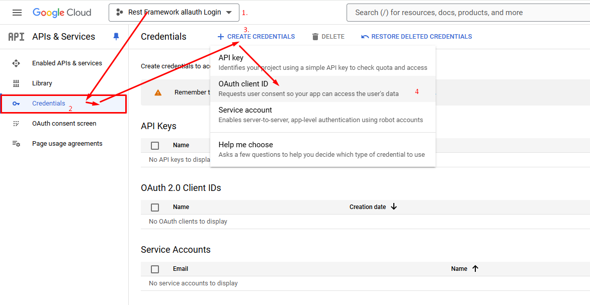 ৩। এবার প্রজেক্ট সিলেক্ট করে credentials তৈরী করি এবং Oauth client id তে ক্লিক করি